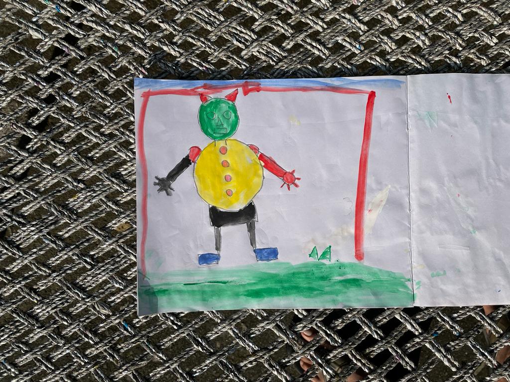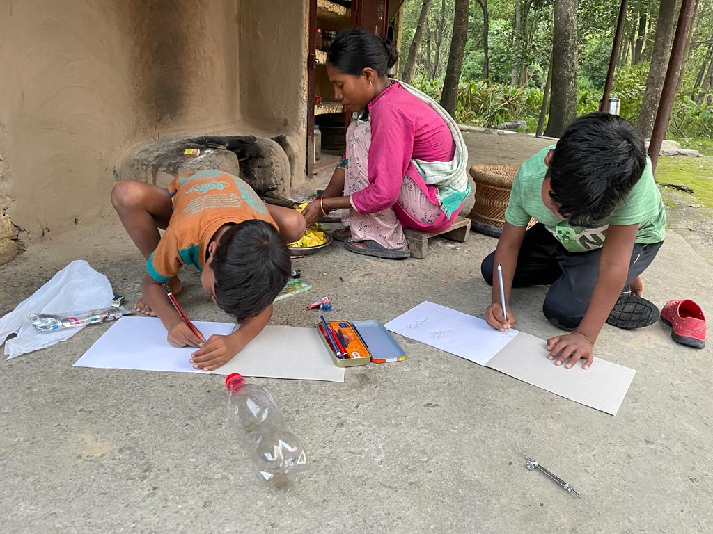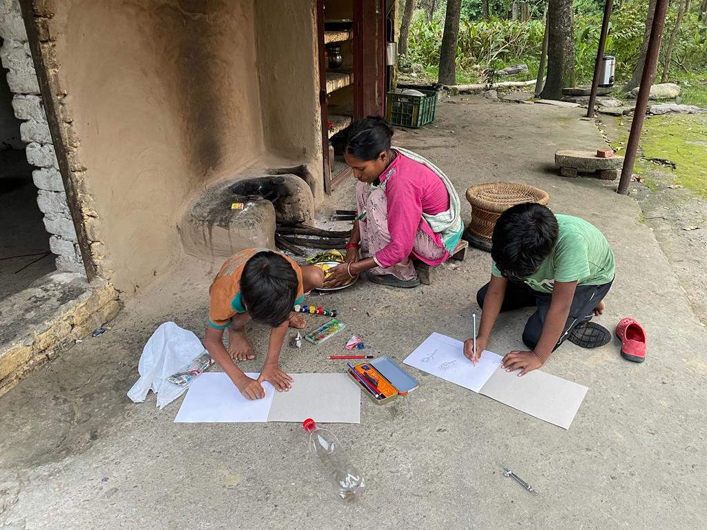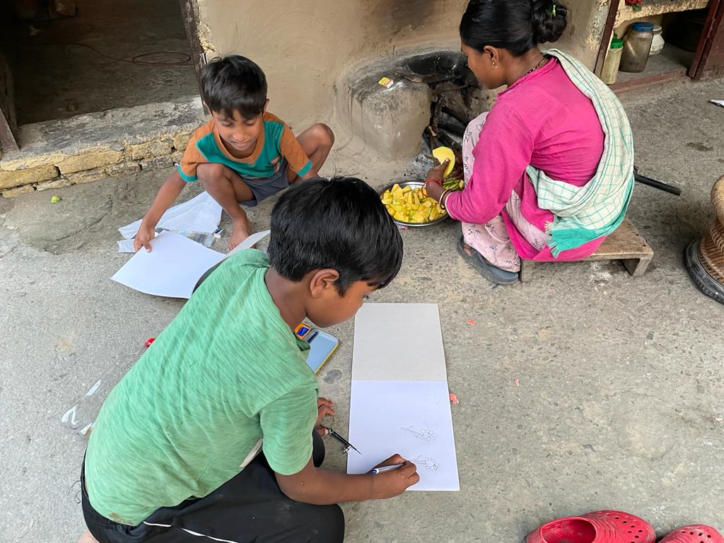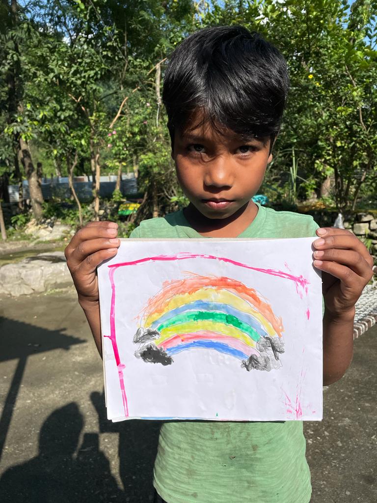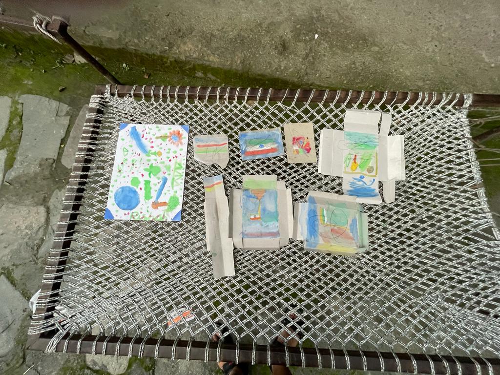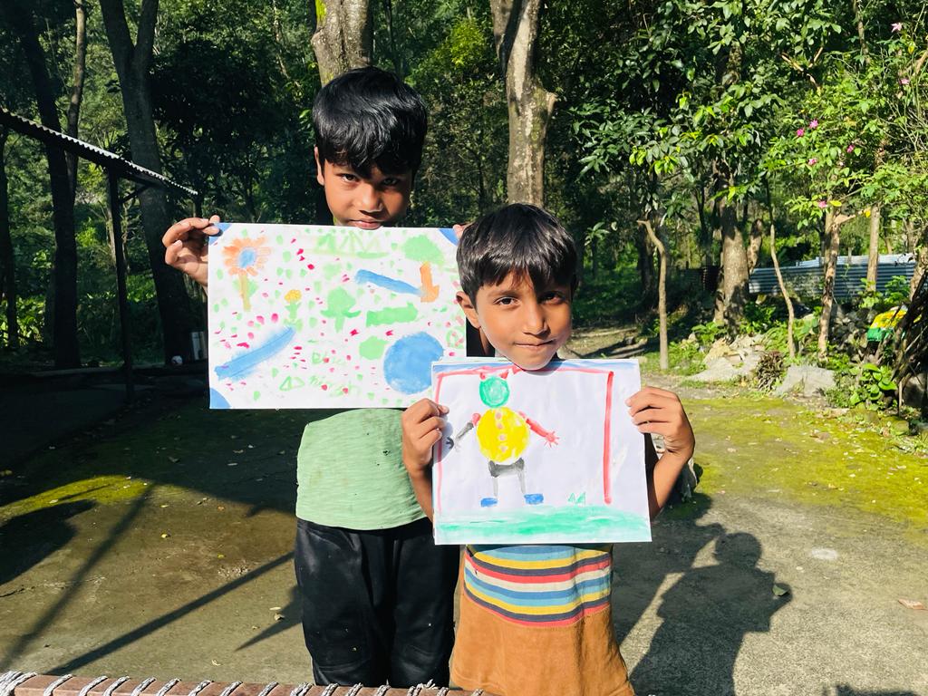 I was happy to see this and at the same time full of sorrow. Here there were children keen to paint but did not have all the required art material. The next day I went to the market and bought art notebooks, colours, brushes, and other materials for all of them. I distributed art materials to the kids and asked them to paint whatever they wished. They made beautiful and impressive paintings.