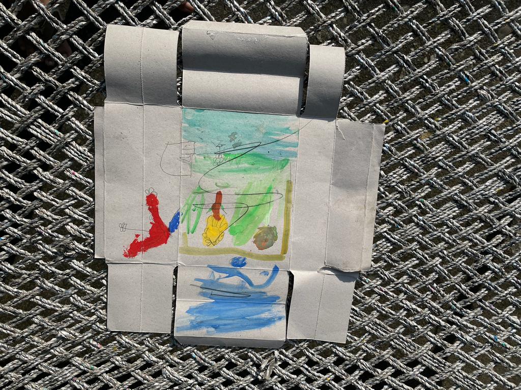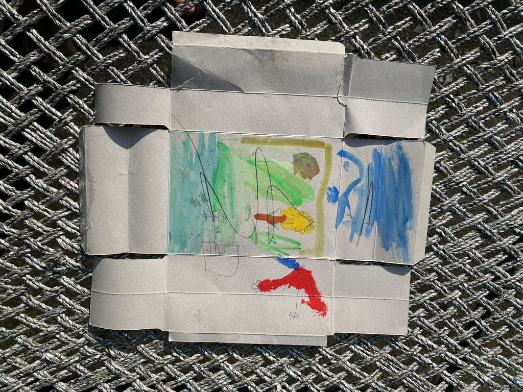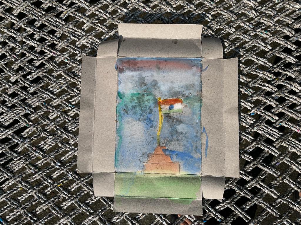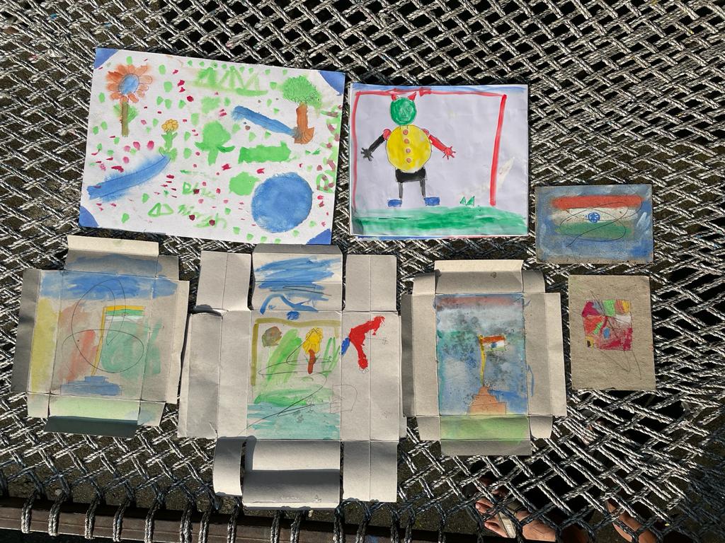 When we returned to the room I saw that both the kids had helped themselves to my colors and brushes. Except they did not have any art paper so they decided to tear up some paper boxes that had served as packaging for sweets and used them as a canvas to paint their beautiful art. They called upon the other neighborhood friends as well. All were there enjoying making art with my paints and brushes on the flimsy paper boxes.